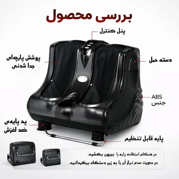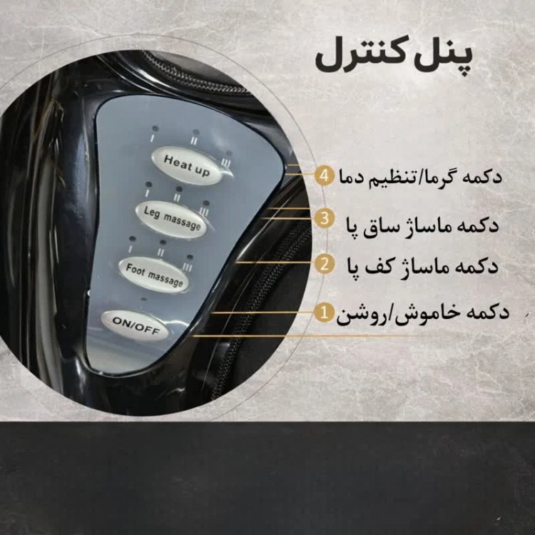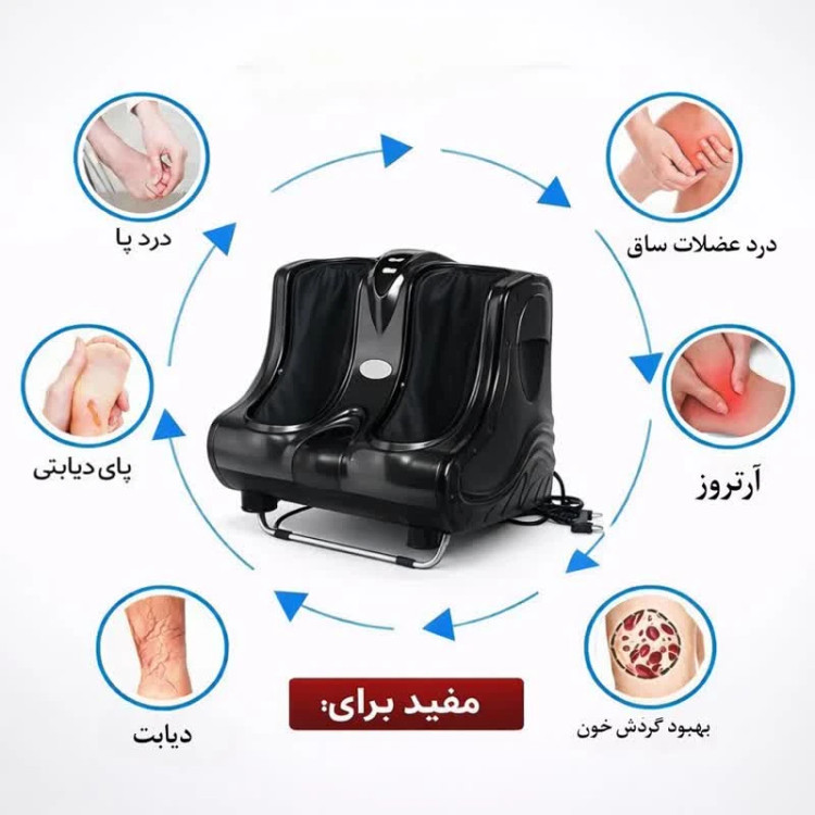 ماساژورچکمه ای کف پا و ساق پا حرفهای با گرمایش و ماساژ عمیق این مدل مناسب کاهش درد و رفع خستگی، یک دستگاه حرفهای و قدرتمند برای ماساژ همزمان کف پا، مچ پا و ساق پا است که با بهرهگیری از سیستم ماساژ ورزشی (Kneading) و لرزشی، ماساژی عمیق و مؤثر را ارائه میدهد. این دستگاه دارای ۴ دیسک ماساژدهنده منعطف است که تجربهای مشابه ماساژ دستی و حرفهای ایجاد میکند و به کاهش درد، رفع گرفتگی عضلات و آرامش کامل کمک مینماید. وجود نقاط فشاری زیر کف پا باعث تحریک نقاط رفلکسولوژی شده و به بهبود گردش خون، کاهش استرس، رفع خستگی و افزایش انرژی کمک میکند. قابلیت گرمایش (Heat Function) باعث گرم شدن عضلات و افزایش تأثیر ماساژ شده و برای افرادی که دچار درد پا، گرفتگی عضلات، واریس، دیابت یا خستگی روزانه هستند، . این ماساژور به کاهش تنشهای عضلانی، درد مفاصل، درد ساق پا و کف پا کمک کرده و برای استفاده روزانه در خانه یا محل کار مناسب است. طراحی ارگونومیک، عملکرد کمصدا، کیفیت ساخت بالا و بدنه مقاوم از جنس ABS، برای استفاده از این ماساژور شخص باید روی یک صندلی بنشیند و پاهای خود را داخل دستگاه قرار دهد. ماساژور دارای کیسهی هوا در قسمتهای ران، ساق پا و روی پا میباشد