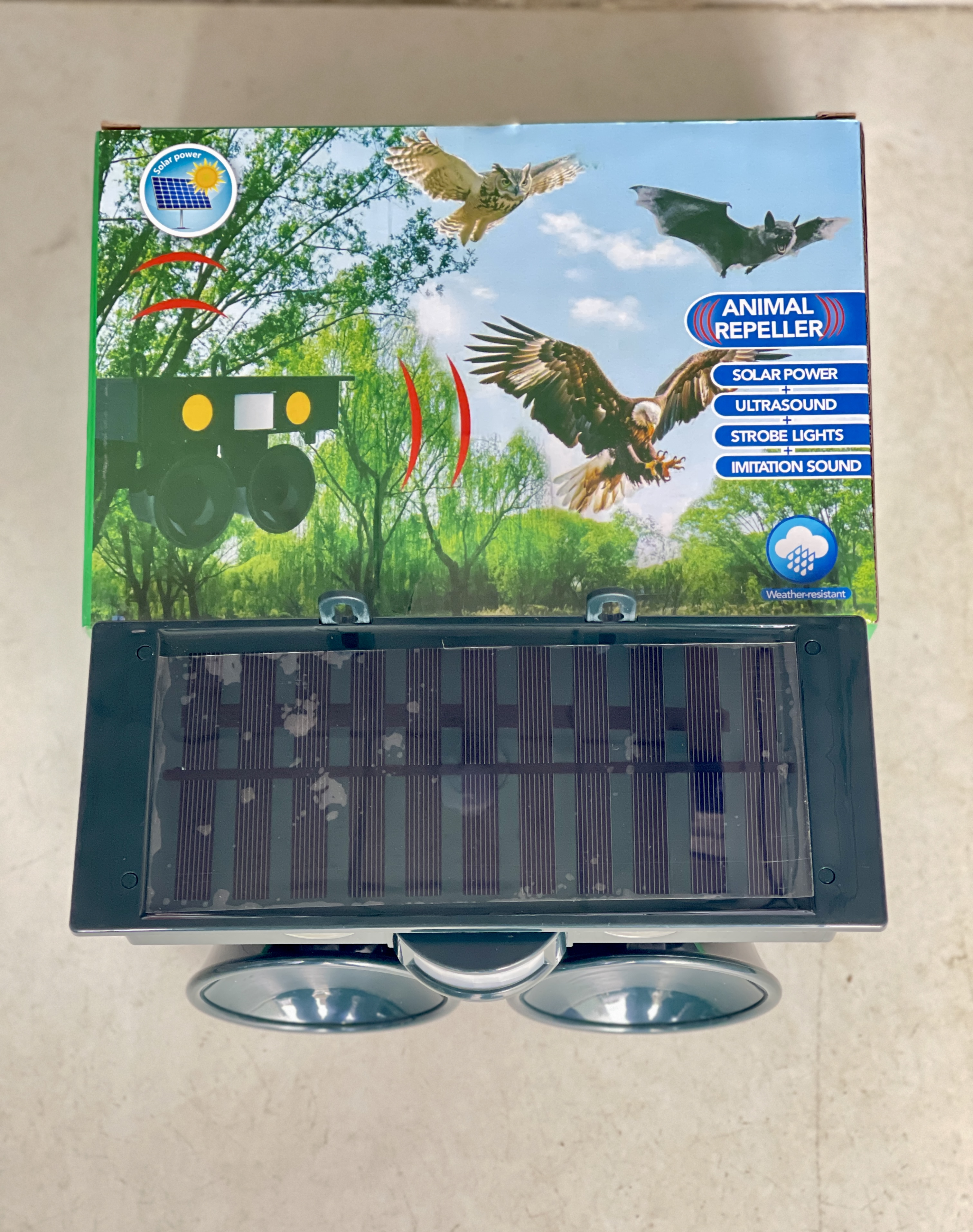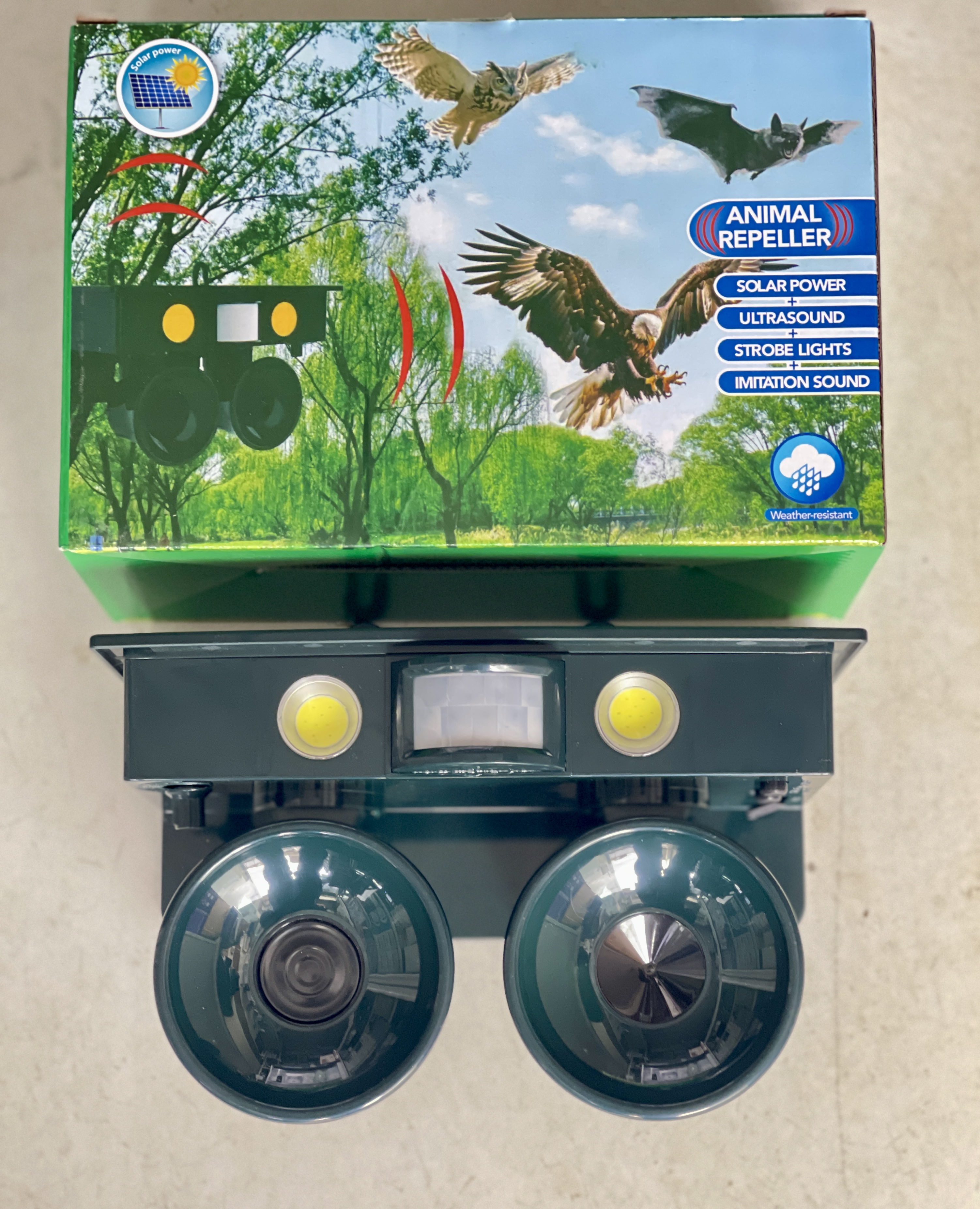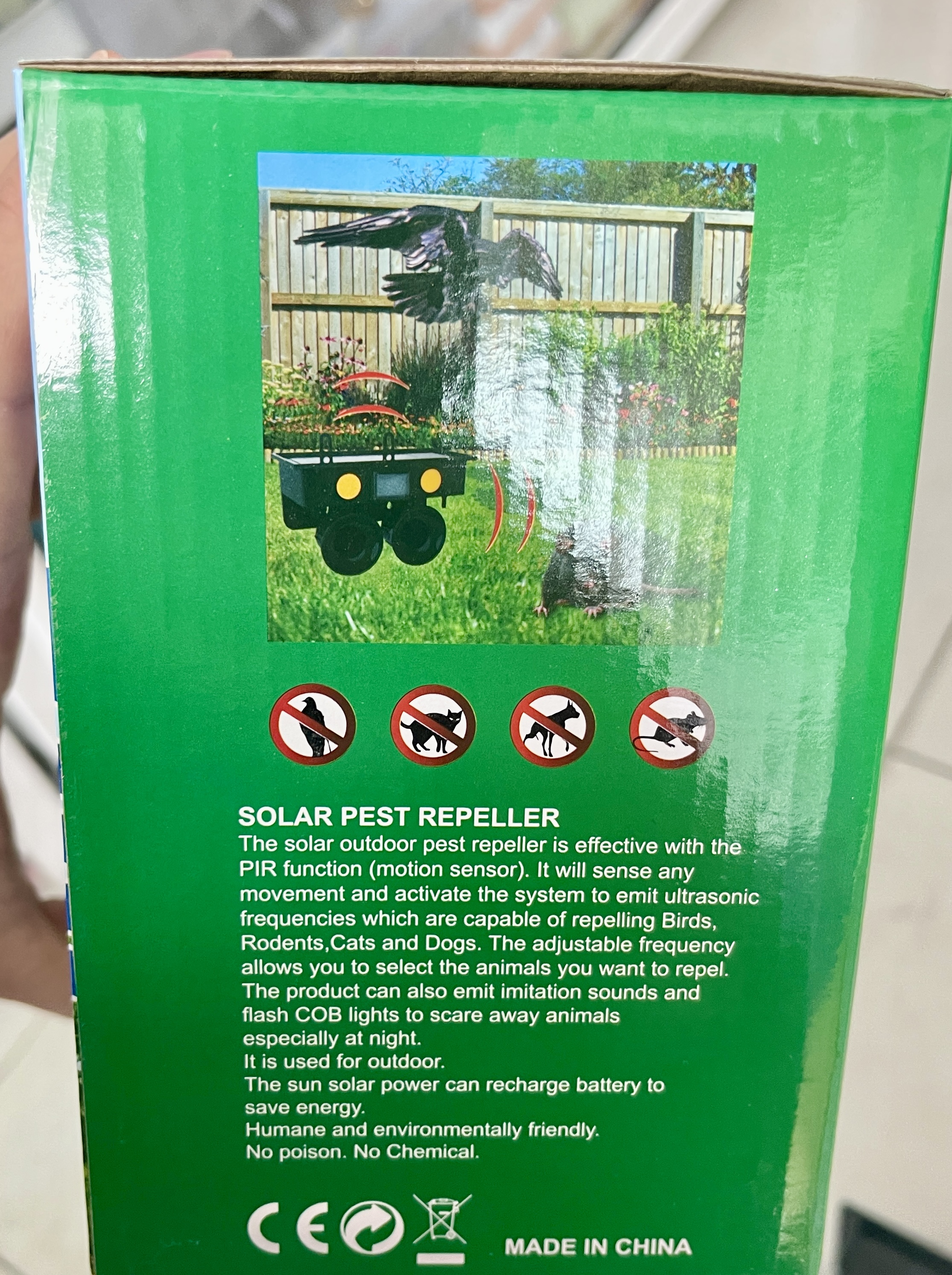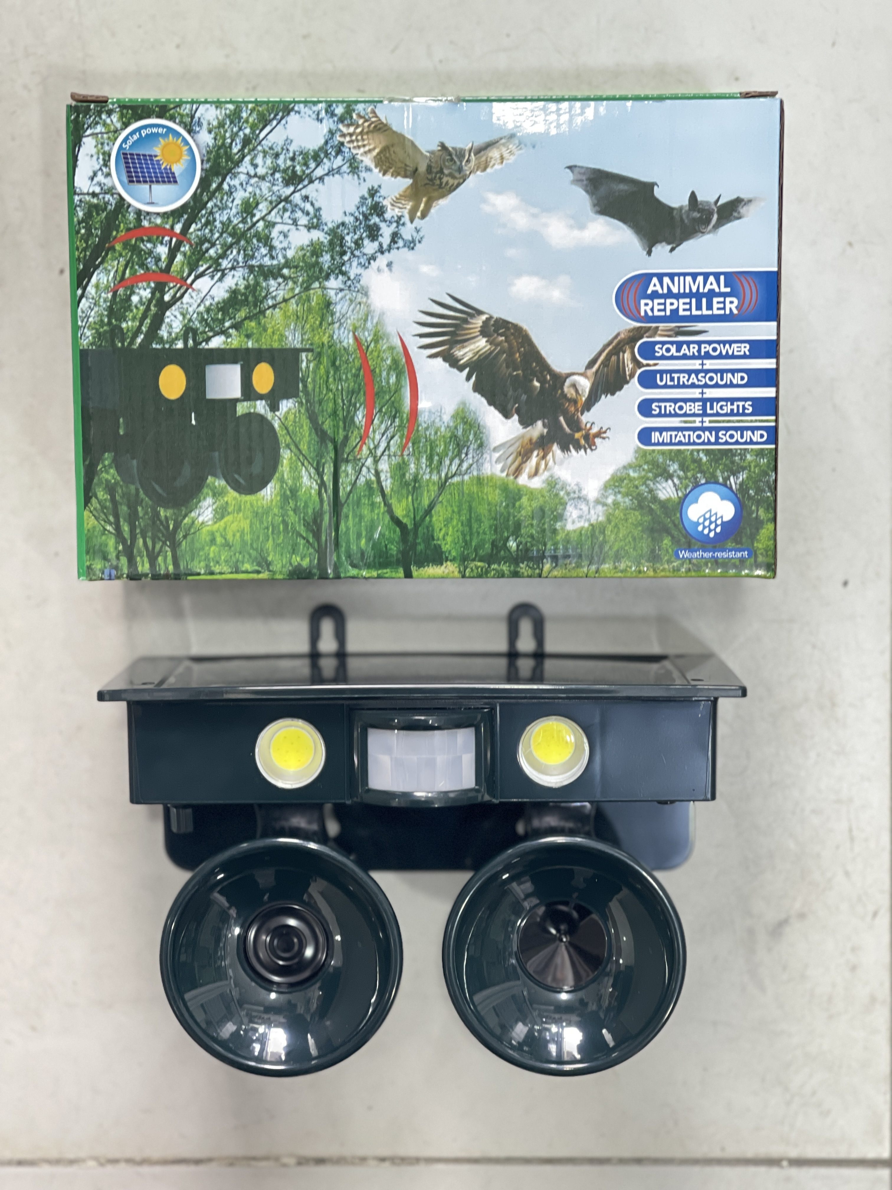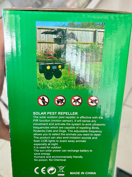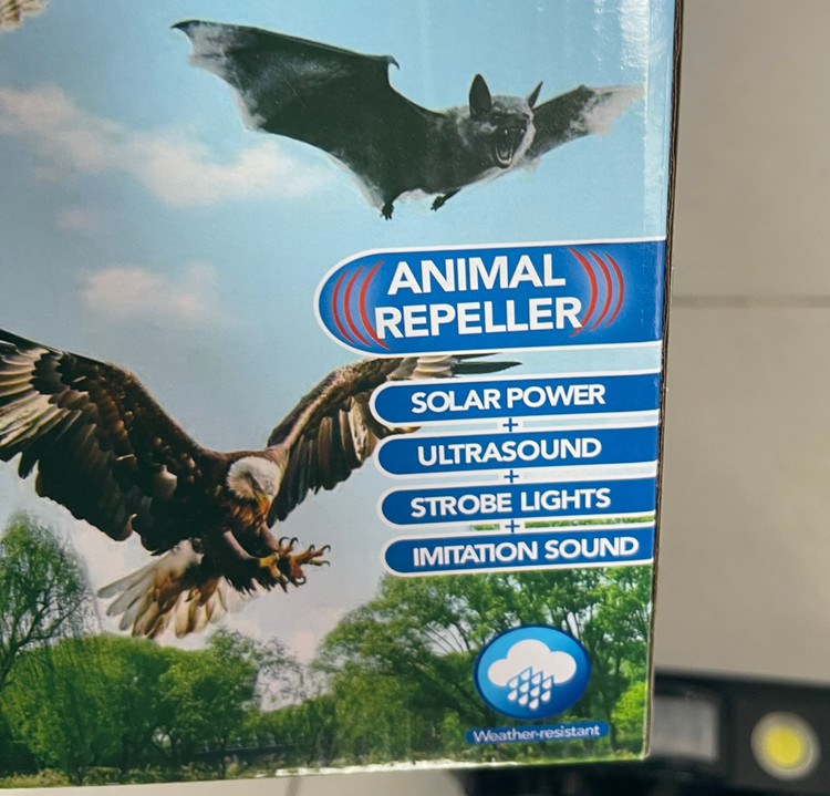حرکت و فعال کردن سیستم برای انتشار اولتراسونیک فرکانس هایی که قادر به دفع پرندگان هستند ، جوندگان ، گربه ها و سگ ها. فرکانس قابل تنظیم به شما امکان می دهد حیواناتی را که می خواهید دفع کنید انتخاب کنید. این محصول همچنین می تواند صداهای تقلیدی را منتشر کند و چراغ های فلش را برای ترساندن حیوانات دور کنید